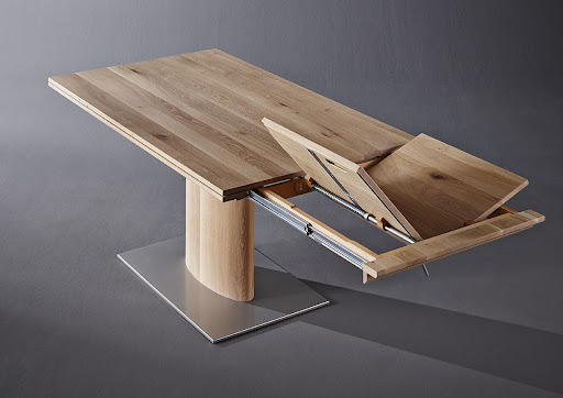 Die Massive Platte Ruht Wie Schwerelos Auf Der Holzernen Saule Dank Dem Stirnauszug Wird Der Tisch Im Handumdrehen Couchtisch Design Tisch Esstisch Ausziehbar